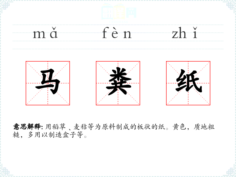 用稻草﹑麦秸等为原料制成的板状的纸。黄色,质地粗糙,多用以制造盒子等。