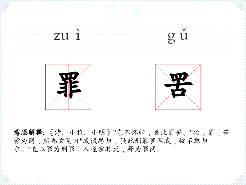 《诗.小雅.小明》"岂不怀归﹐畏此罪罟。"按﹐罪﹑罟皆为网﹐然郑玄笺曰"我诚思归﹐畏此刑罪罗网我﹐故不敢归尔。"直以罪为刑罪◇人遂宗其说﹐释为罪网。