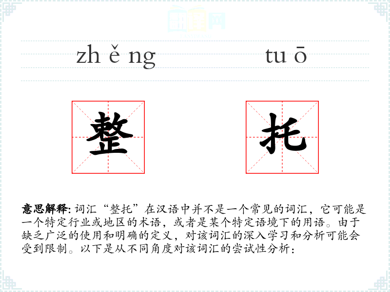 由于“整托”不是一个标准词汇,对其的理解和应用需要具体的语境。在语言学习和表达中,了解特定行业或地区的术语是很重要的,但“整托”作为一个词汇,其使用和理解可能需要更多的信息和背景知识。