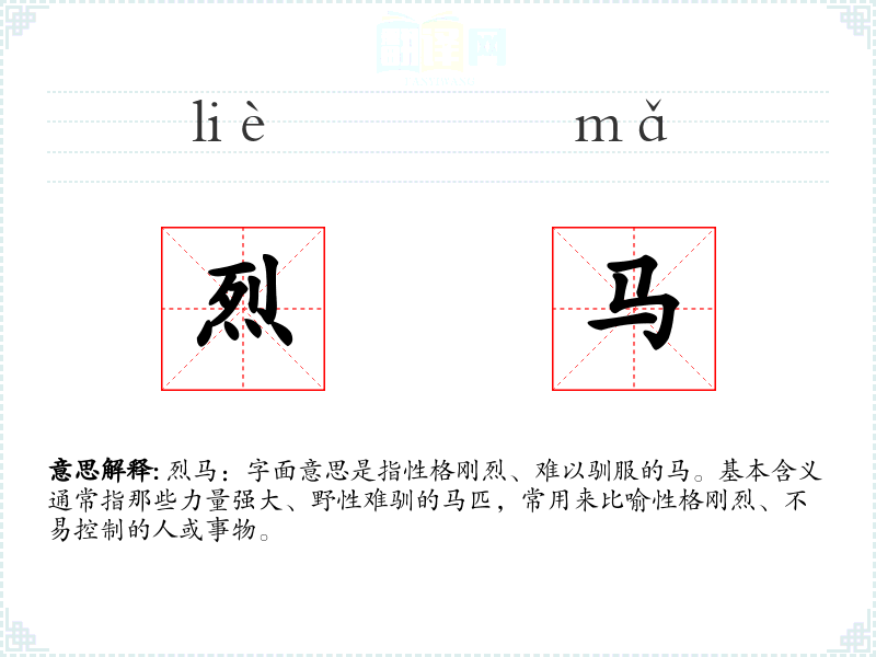 烈马:字面意思是指性格刚烈、难以驯服的马。基本含义通常指那些力量强大、野性难驯的马匹,常用来比喻性格刚烈、不易控制的人或事物。