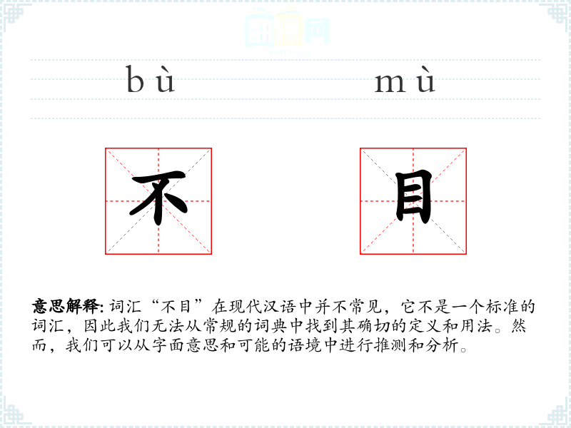 词汇“不目”在现代汉语中并不常见,它不是一个标准的词汇,因此我们无法从常规的词典中找到其确切的定义和用法。然而,我们可以从字面意思和可能的语境中进行推测和分析。