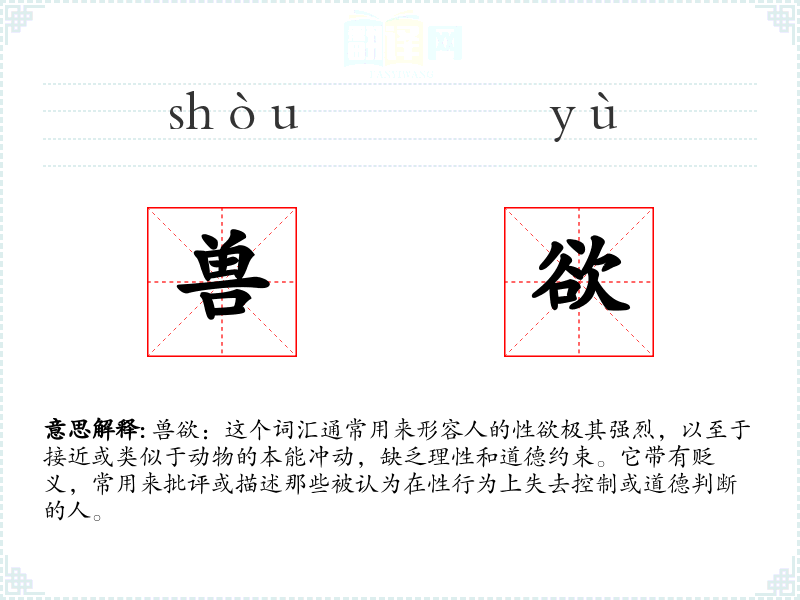 兽欲:这个词汇通常用来形容人的性欲极其强烈,以至于接近或类似于动物的本能冲动,缺乏理性和道德约束。它带有贬义,常用来批评或描述那些被认为在性行为上失去控制或道德判断的人。