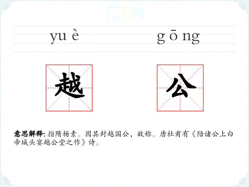 指隋杨素。因其封越国公,故称。唐杜甫有《陪诸公上白帝城头宴越公堂之作》诗。