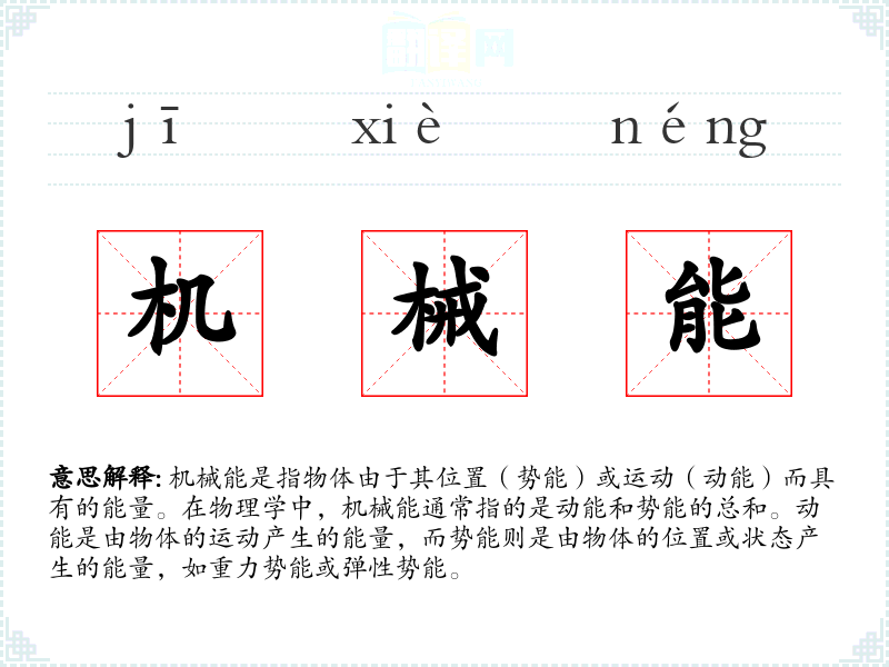 同义词:动能、势能、能量 反义词:无(因为“机械能”是一个具体的能量形式,没有直接的反义词)