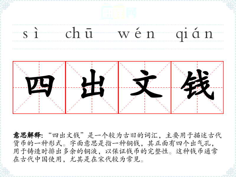 “四出文钱”作为一个历史词汇,不仅承载了古代货币的具体信息,也反映了古代社会的经济和技术状况。在语言学*和表达中,了解这样的词汇有助于更深入地理解历史和文化,增强语言的丰富性和深度。