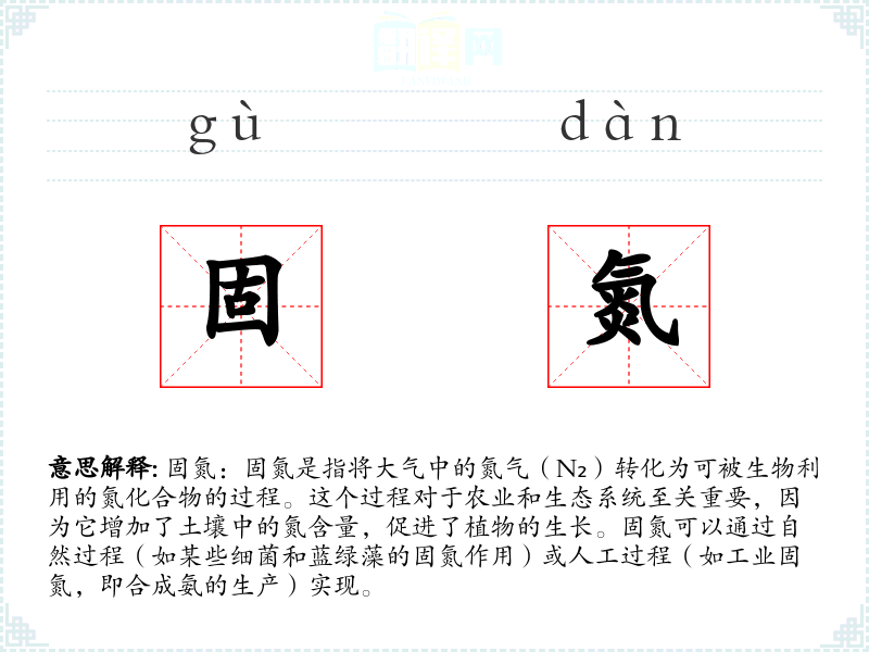 - 词源:固氮这个词由“固”和“氮”两个字组成,其中“固”表示固定或转化,“氮”指的是氮元素。