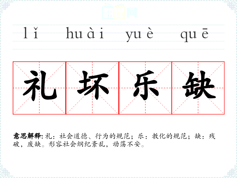 礼:社会道德、行为的规范;乐:教化的规范;缺:残破,废缺。形容社会纲纪紊乱,
