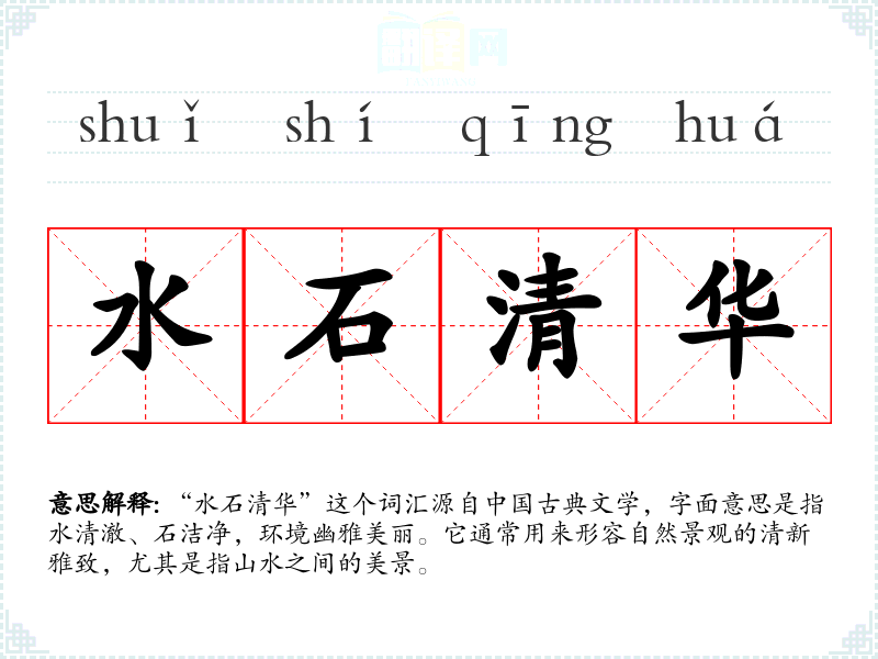 “水石清华”这个词汇源自**古典文学,字面意思是指水清澈、石洁净,环境幽雅美丽。它通常用来形容自然景观的清新雅致,尤其是指山水之间的美景。