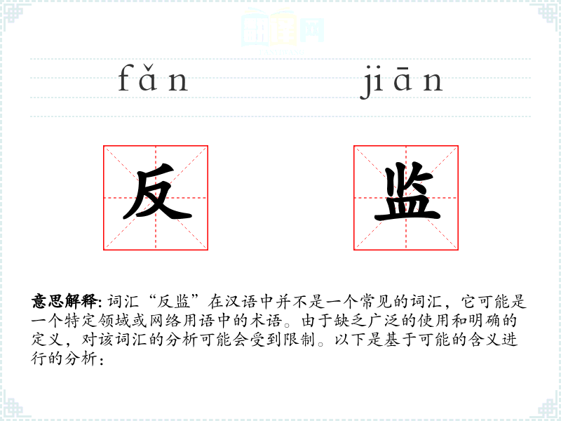 词汇“反监”在汉语中并不是一个常见的词汇,它可能是一个特定领域或网络用语中的术语。由于缺乏广泛的使用和明确的定义,对该词汇的分析可能会受到限制。以下是基于可能的含义进行的分析: