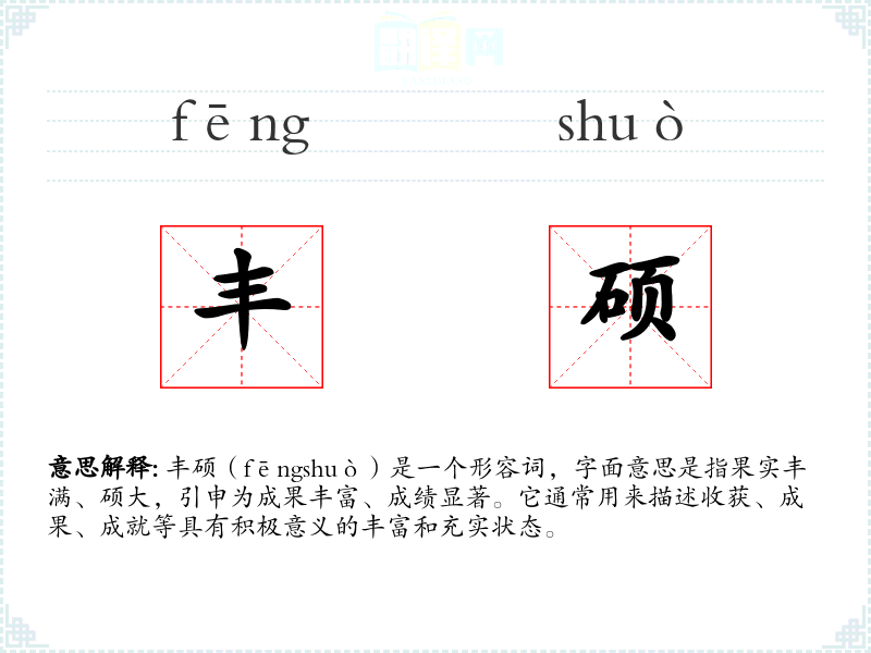 丰硕(fēngshuò)是一个形容词,字面意思是指果实丰满、硕大,引申为成果丰富、成绩显著。它通常用来描述收获、成果、成就等具有积极意义的丰富和充实状态。