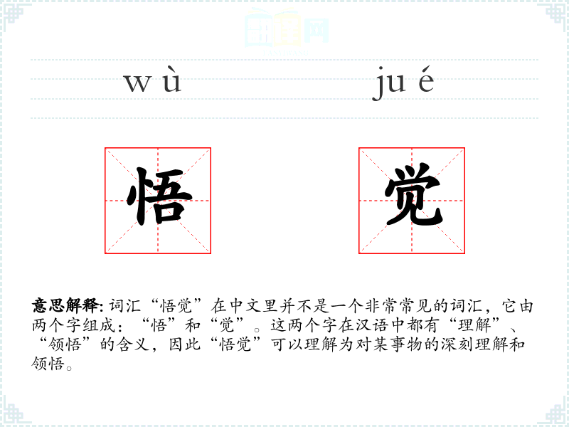 词汇“悟觉”在中文里并不是一个非常常见的词汇,它由两个字组成:“悟”和“觉”。这两个字在汉语中都有“理解”、“领悟”的含义,因此“悟觉”可以理解为对某事物的深刻理解和领悟。
