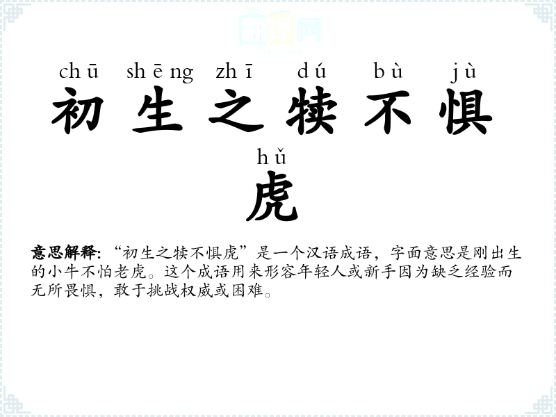 这个成语出自《左传·宣公十五年》:“初生之犊不惧虎,以其未尝虎也。”原意是说小牛因为没有经历过的威胁,所以不怕。后来逐渐演变成形容年轻人或新手的大胆和无畏。