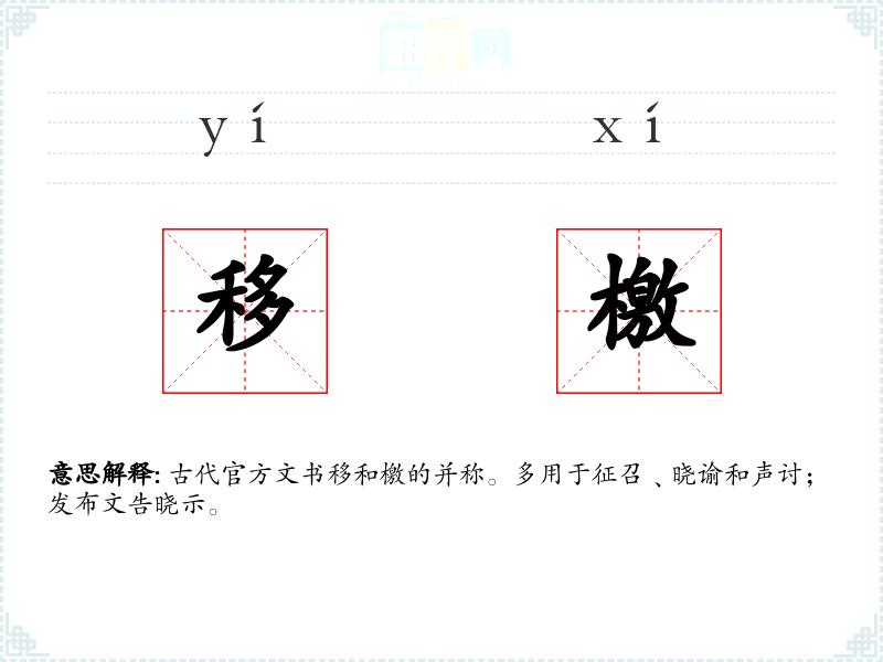 古代官方文书移和檄的并称。多用于征召﹑晓谕和声讨; 发布文告晓示。