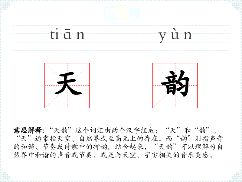 “天韵”这个词在古代汉语中并不常见,更多是在现代文学和艺术评论中被创造和使用。它的词源可以追溯到对自然界声音美感的追求和表达。