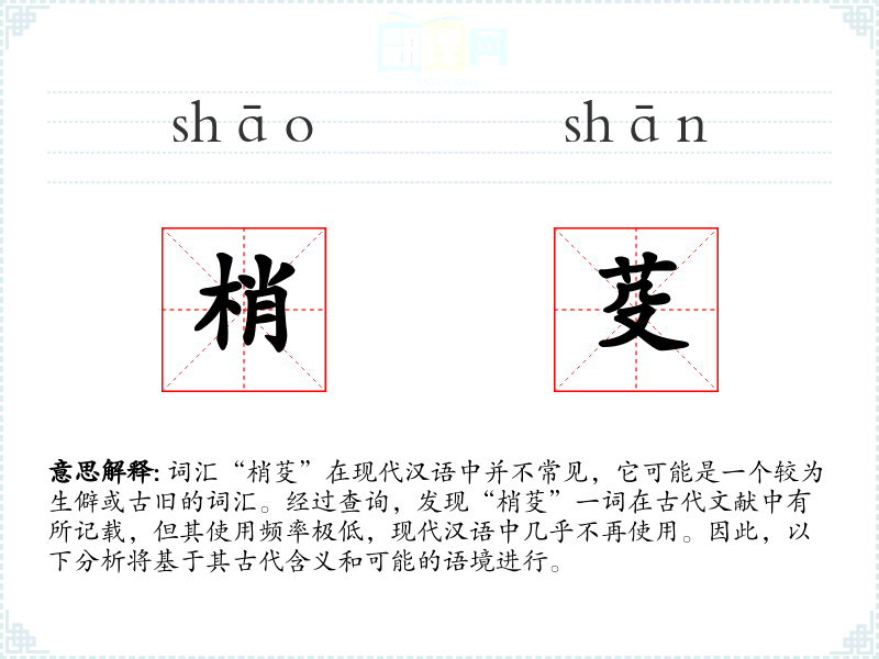 词汇“梢芟”在现代汉语中并不常见,它可能是一个较为生僻或古旧的词汇。经过查询,发现“梢芟”一词在古代文献中有所记载,但其使用频率极低,现代汉语中几乎不再使用。因此,以下分析将基于其古代含义和可能的语境进行。