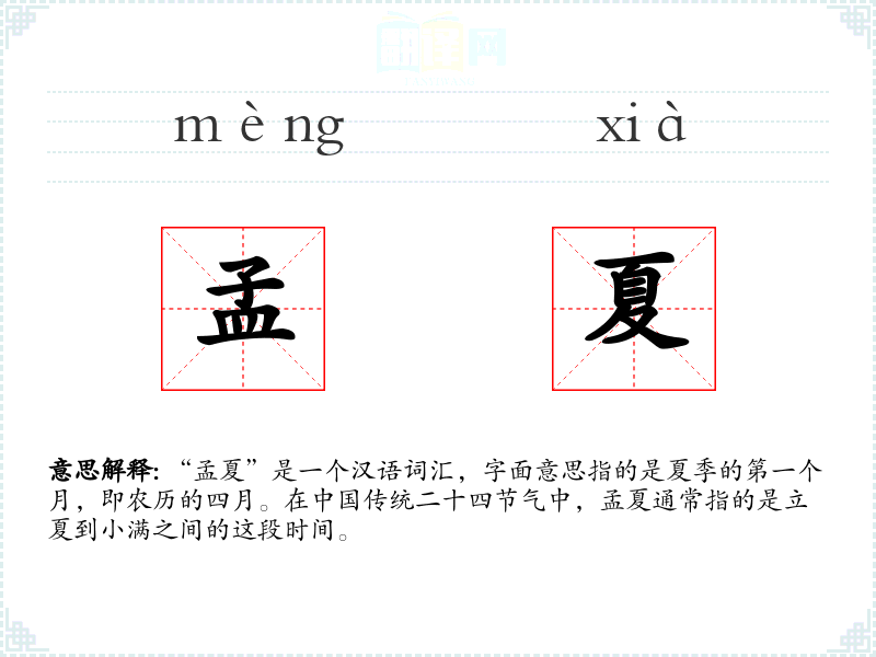 “孟夏”是一个汉语词汇,字面意思指的是夏季的第一个月,即农历的四月。在**传统二十四节气中,孟夏通常指的是立夏到小满之间的这段时间。