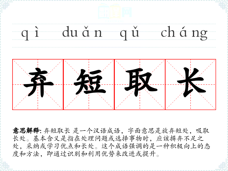 弃短取长 是一个汉语成语,字面意思是放弃短处,吸取长处。基本含义是指在处理问题或选择事物时,应该摒弃不足之处,采纳或学*优点和长处。这个成语强调的是一种积极向上的态度和方法,即通过识别和利用优势来改进或提升。