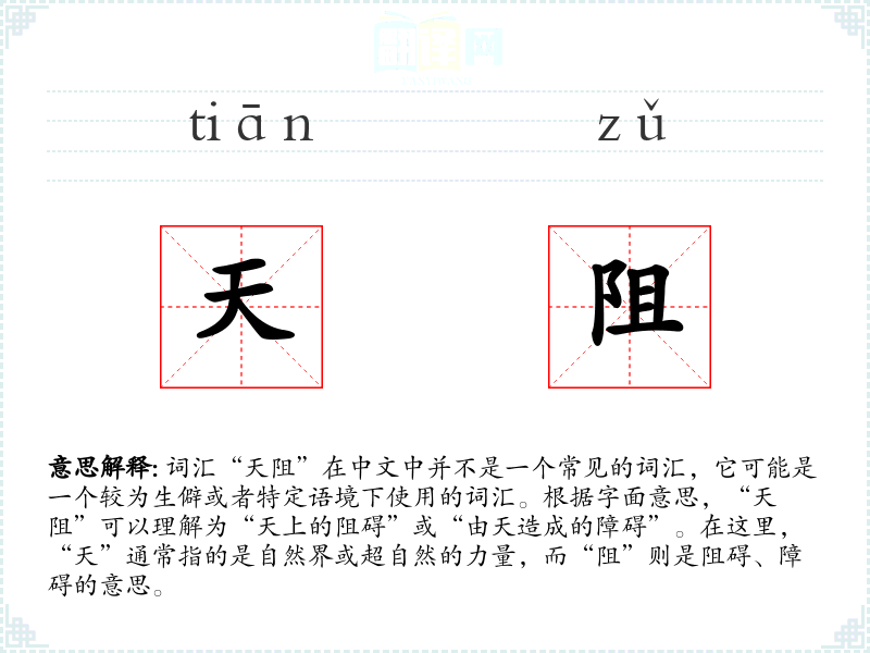 词汇“天阻”在中文中并不是一个常见的词汇,它可能是一个较为生僻或者特定语境下使用的词汇。根据字面意思,“天阻”可以理解为“天上的阻碍”或“由天造成的障碍”。在这里,“天”通常指的是自然界或超自然的力量,而“阻”则是阻碍、障碍的意思。