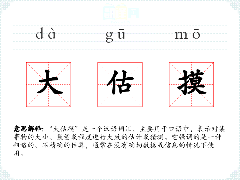 - 口语:在日常对话中,人们常用“大估摸”来表达对某事的粗略估计,尤其是在缺乏具体信息时。