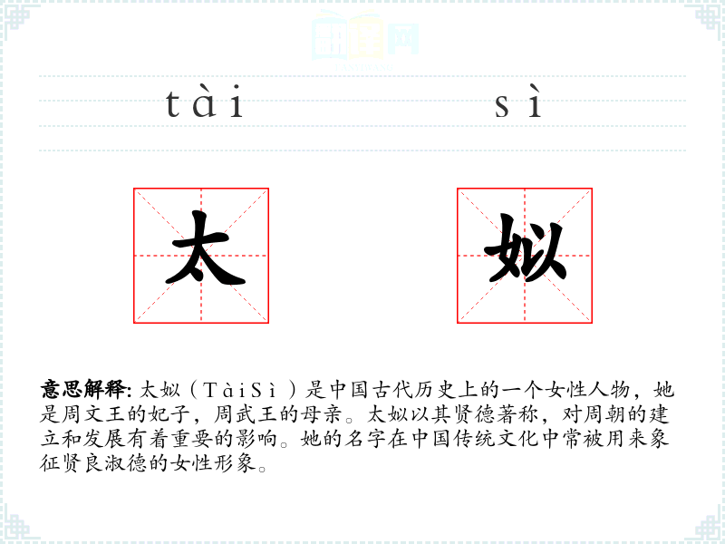 太姒(Tài Sì)是古代历史上的一个女性人物,她是周文王的妃子,周武王的母亲。太姒以其贤德著称,对周朝的建立和发展有着重要的影响。她的名字在传统文化中常被用来象征贤良淑德的女性形象。