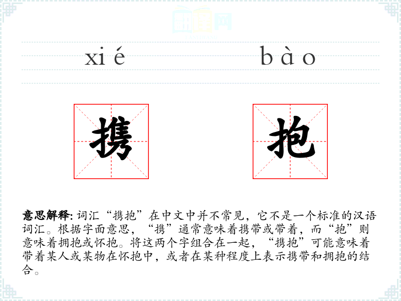 由于“携抱”不是一个常用词汇,它在不同的语境中可能不太常见。然而,如果在一个非常文学化的语境中,这个词可能用来形容一种深情的、保护性的携带方式。