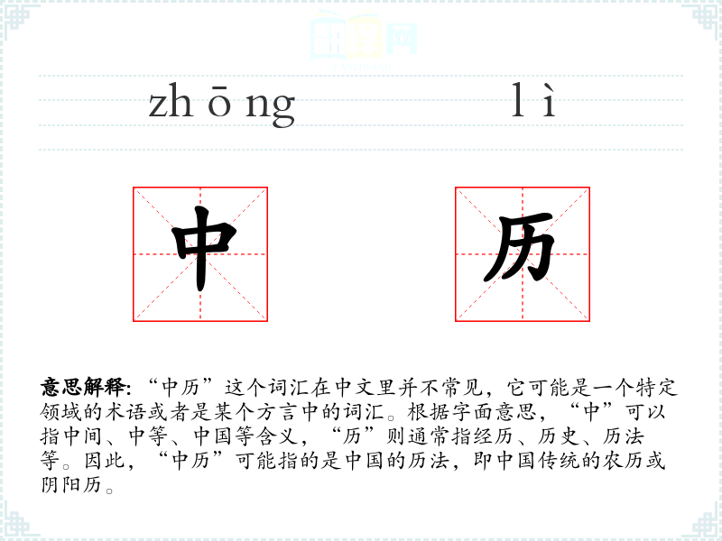 “中历”这个词汇在中文里并不常见,它可能是一个特定领域的术语或者是某个方言中的词汇。根据字面意思,“中”可以指中间、中等、等含义,“历”则通常指经历、历史、历法等。因此,“中历”可能指的是的历法,即**传统的农历或阴阳历。