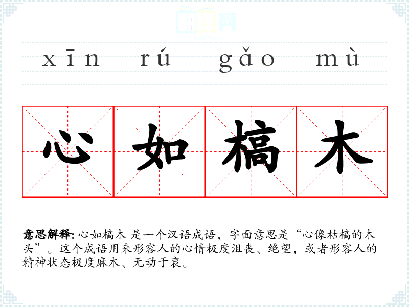心如槁木 是一个汉语成语,字面意思是“心像枯槁的木头”。这个成语用来形容人的心情极度沮丧、绝望,或者形容人的精神状态极度麻木、无动于衷。