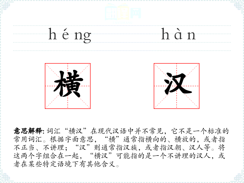词汇“横汉”在现代汉语中并不常见,它不是一个标准的常用词汇。根据字面意思,“横”通常指横向的、横放的,或者指不正当、不讲理;“汉”则通常指**,或者指汉朝、汉人等。将这两个字组合在一起,“横汉”可能指的是一个不讲理的汉人,或者在某些特定语境下有其他含义。