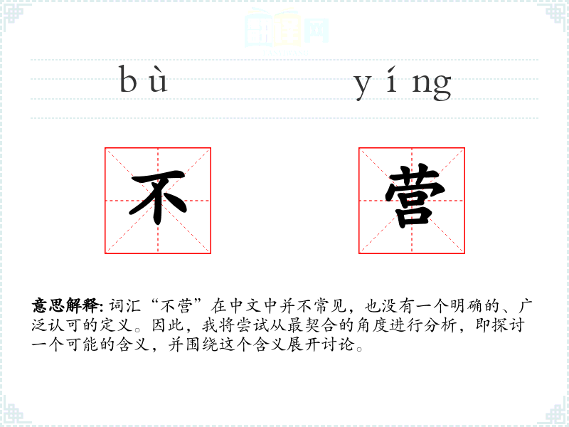 由于“不营”不是一个标准的词汇,我们可以假设它可能是由“不”和“营”两个字组合而成的。在这里,“不”表示否定,而“营”可以指经营、营地或营救等。因此,“不营”可能意味着“不进行经营”、“不在营地”或“不进行营救”等。