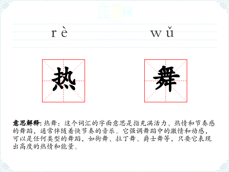热舞:这个词汇的字面意思是指充满活力、热情和节奏感的舞蹈,通常伴随着快节奏的音乐。它强调舞蹈中的激情和动感,可以是任何类型的舞蹈,如街舞、拉丁舞、爵士舞等,只要它表现出高度的热情和能量。
