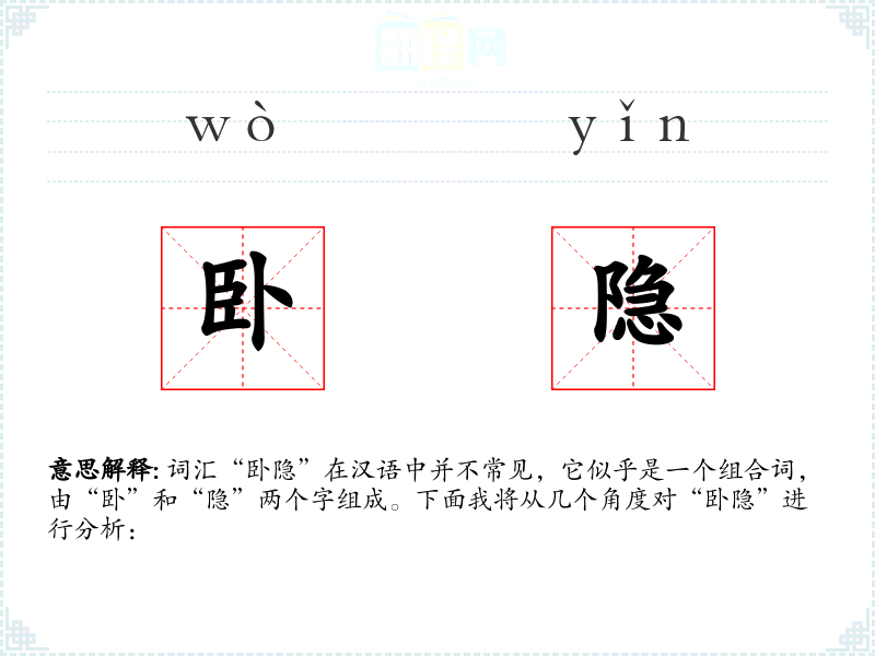 词汇“卧隐”在汉语中并不常见,它似乎是一个组合词,由“卧”和“隐”两个字组成。下面我将从几个角度对“卧隐”进行分析: