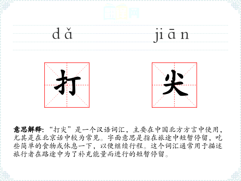 “打尖”是一个汉语词汇,主要在**北方方言中使用,尤其是在北京话中较为常见。字面意思是指在旅途中短暂停留,吃些简单的食物或休息一下,以便继续行程。这个词汇通常用于描述旅行者在路途中为了补充能量而进行的短暂停留。