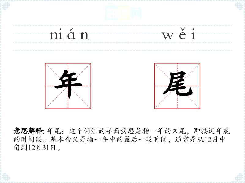 年尾:这个词汇的字面意思是指一年的末尾,即接近年底的时间段。基本含义是指一年中的最后一段时间,通常是从12月中旬到12月31日。