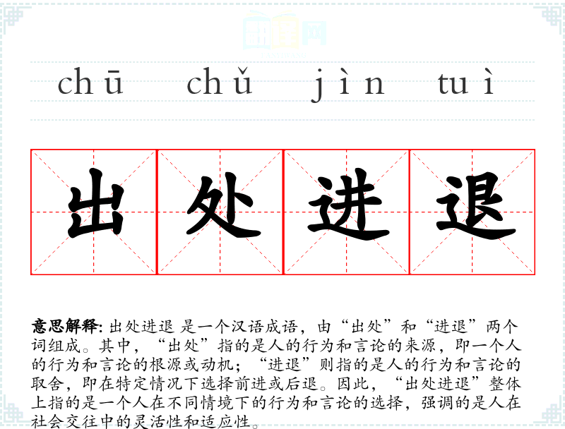 “出处进退”这个成语的词源较为模糊,但它反映了古代**社会对于个人行为和言论的高度重视。随着社会的发展,这个词汇的含义和用法也在不断演变,但其核心意义——即在不同情境下的行为和言论的选择——仍然保持不变。