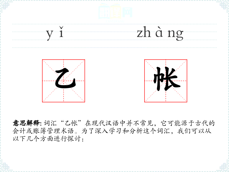词汇“乙帐”在现代汉语中并不常见,它可能源于古代的会计或账簿管理术语。为了深入学*和分析这个词汇,我们可以从以下几个方面进行探讨: