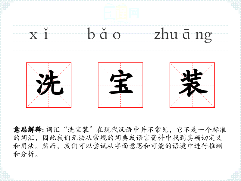 “洗宝装”可能是由“洗”、“宝”和“装”三个字组合而成的词汇。其中,“洗”通常指清洗或洗涤的动作,“宝”指珍贵的东西,“装”可以指装饰或包装。因此,从字面意思来看,“洗宝装”可能指的是对珍贵物品进行清洗或装饰的过程。