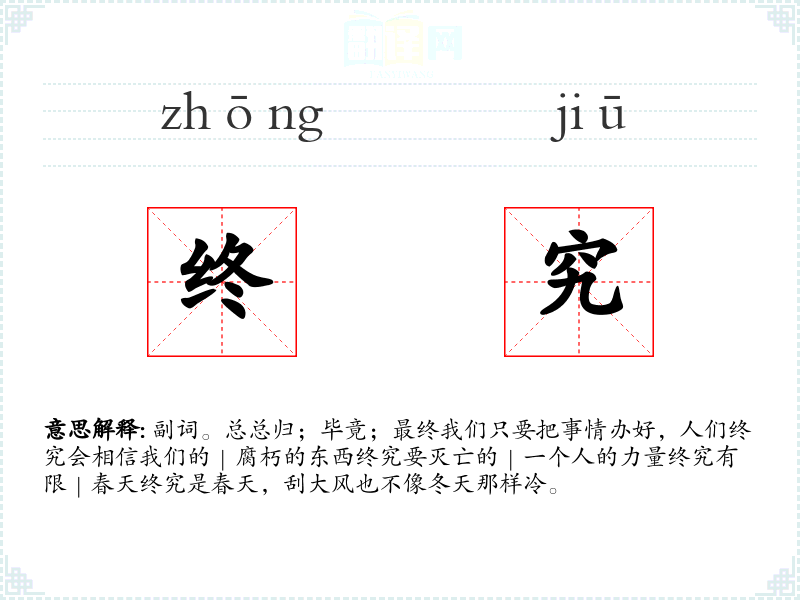 副词。总总归;毕竟;最终我们只要把事情办好,人们终究会相信我们的|腐朽的东西终究要灭亡的|一个人的力量终究有限|春天终究是春天,刮大风也不像冬天那样冷。