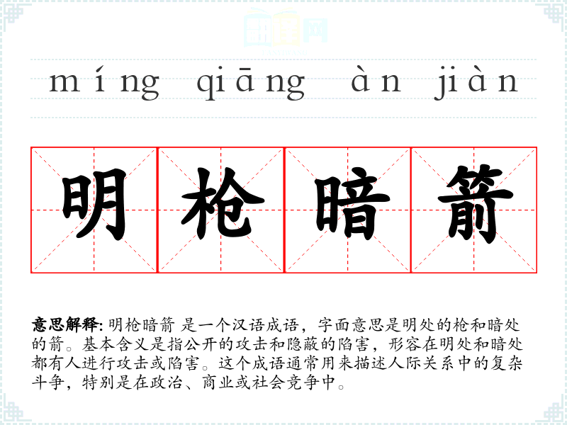 明枪暗箭 是一个汉语成语,字面意思是明处的枪和暗处的箭。基本含义是指公开的攻击和隐蔽的陷害,形容在明处和暗处都有人进行攻击或陷害。这个成语通常用来描述人际关系中的复杂斗争,特别是在政治、商业或社会竞争中。