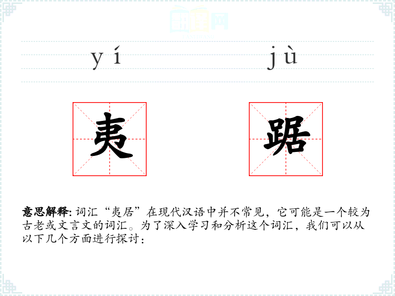 词汇“夷居”在现代汉语中并不常见,它可能是一个较为古老或文言文的词汇。为了深入学*和分析这个词汇,我们可以从以下几个方面进行探讨: