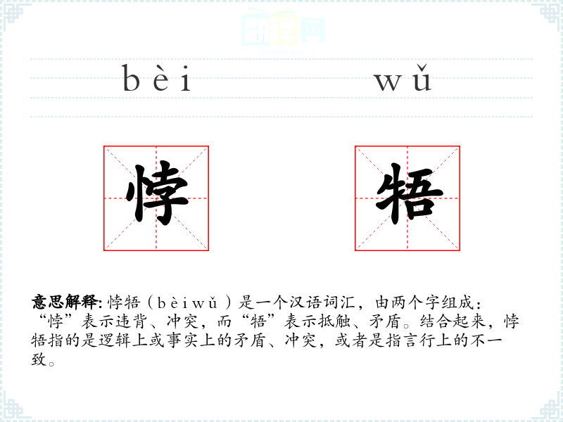 悖牾(bèi wǔ)是一个汉语词汇,由两个字组成:“悖”表示违背、冲突,而“牾”表示抵触、矛盾。结合起来,悖牾指的是逻辑上或事实上的矛盾、冲突,或者是指言行上的不一致。