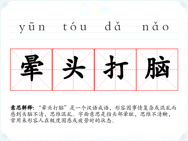 “晕头打脑”是一个汉语成语,形容因事情复杂或混乱而感到头脑不清,思维混乱。字面意思是指头部晕眩,思维不清晰,常用来形容人在极度困惑或疲劳时的状态。