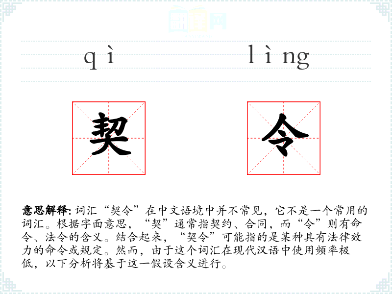 词汇“契令”在中文语境中并不常见,它不是一个常用的词汇。根据字面意思,“契”通常指契约、合同,而“令”则有命令、法令的含义。结合起来,“契令”可能指的是某种具有法律效力的命令或规定。然而,由于这个词汇在现代汉语中使用频率极低,以下分析将基于这一假设含义进行。