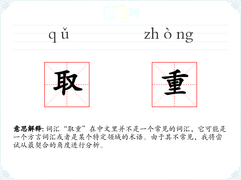 词汇“取重”在中文里并不是一个常见的词汇,它可能是一个方言词汇或者是某个特定领域的术语。由于其不常见,我将尝试从最契合的角度进行分析。