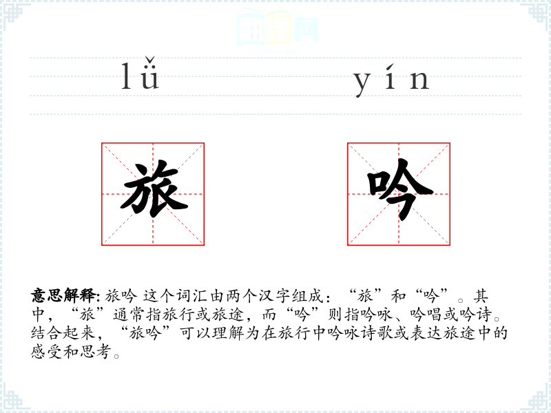 旅吟 这个词汇由两个汉字组成:“旅”和“吟”。其中,“旅”通常指旅行或旅途,而“吟”则指吟咏、吟唱或吟诗。结合起来,“旅吟”可以理解为在旅行中吟咏诗歌或表达旅途中的感受和思考。