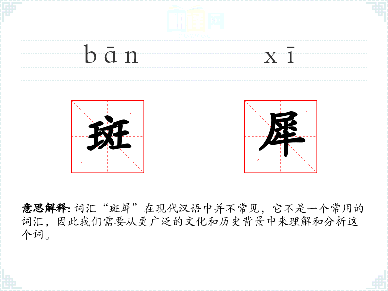 - 反义词:无(由于“斑犀”不是一个常用词汇,很难找到直接的反义词)