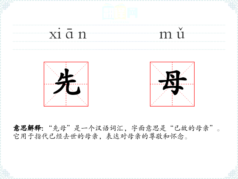 - 同义词:亡母、故母、先妣(文言文中常用)