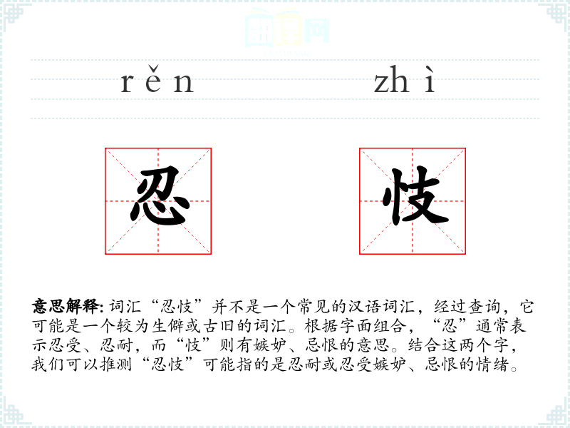 词汇“忍忮”并不是一个常见的汉语词汇,经过查询,它可能是一个较为生僻或古旧的词汇。根据字面组合,“忍”通常表示忍受、忍耐,而“忮”则有嫉妒、忌恨的意思。结合这两个字,我们可以推测“忍忮”可能指的是忍耐或忍受嫉妒、忌恨的情绪。