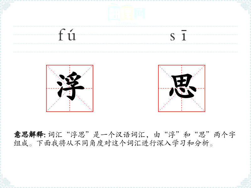 词汇“浮思”是一个汉语词汇,由“浮”和“思”两个字组成。下面我将从不同角度对这个词汇进行深入学*和分析。