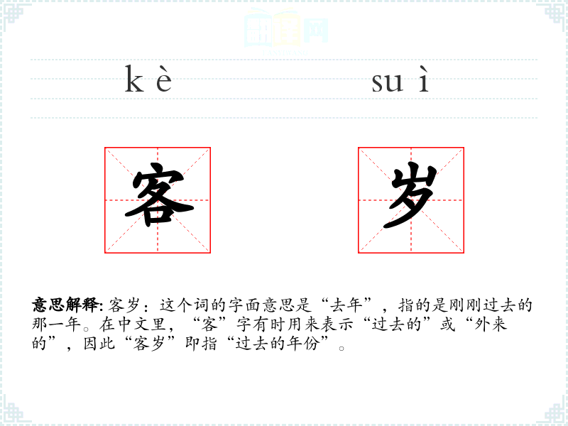 客岁:这个词的字面意思是“去年”,指的是刚刚过去的那一年。在中文里,“客”字有时用来表示“过去的”或“外来的”,因此“客岁”即指“过去的年份”。