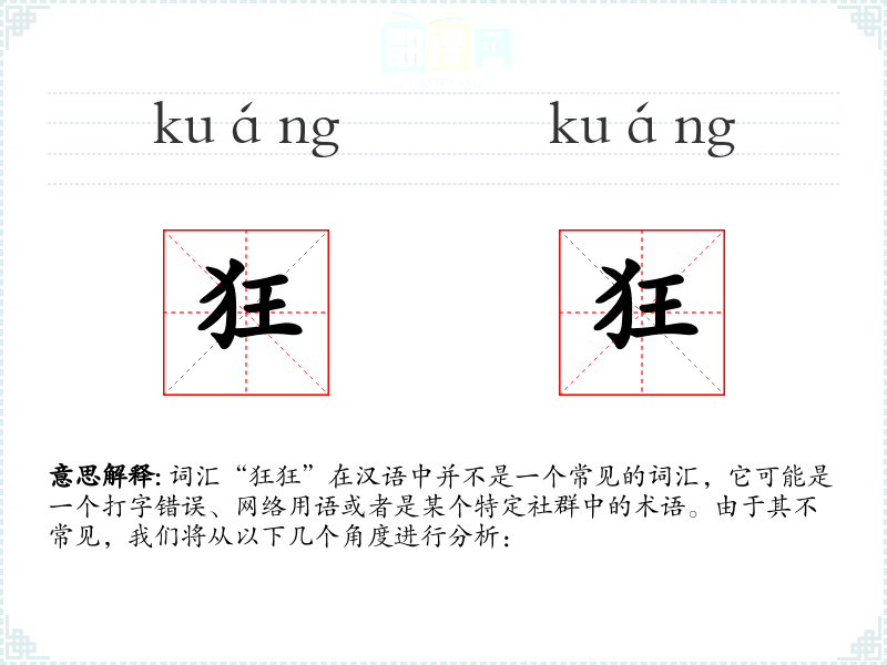 由于“狂狂”不是一个标准的汉语词汇,我们无法给出一个确切的基本定义。它可能是“狂”字的重复,用来强调某种极端的状态或行为。